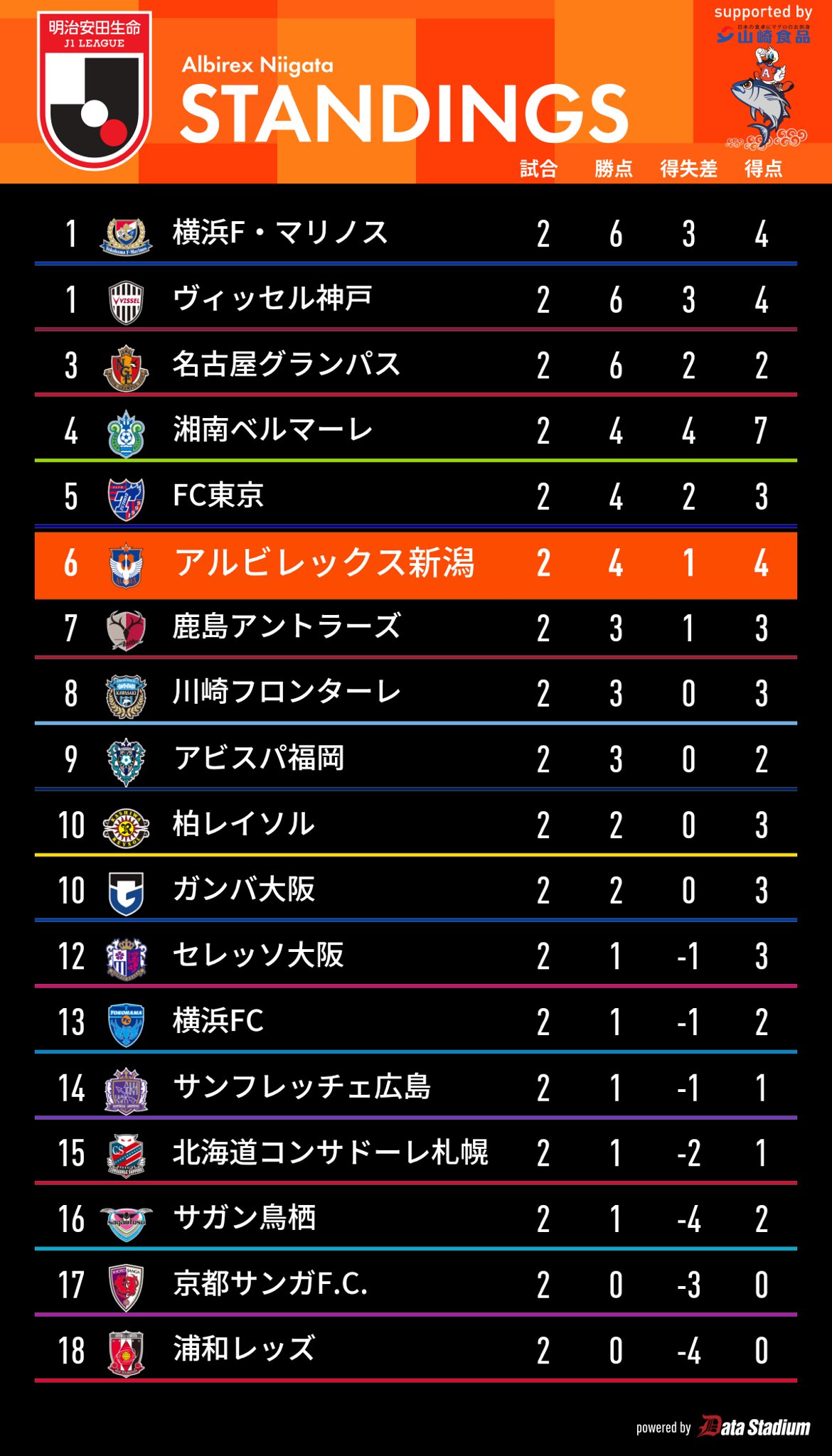 アルビレックス新潟 On Twitter 本日の全試合を終えての最新順位表 明治安田生命j1リーグ アルビレックス新潟 Albirex Https T Co Tzaiw1nsdu Twitter
